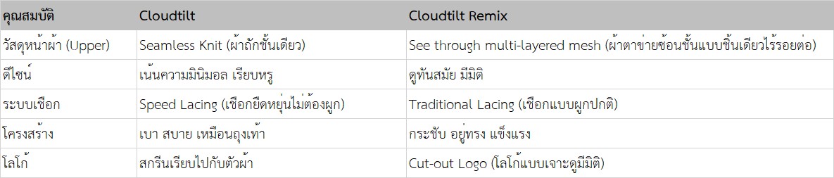 Cloudtilt Remix : โดดเด่นด้วยดีไซน์หน้าผ้า See through ชิ้นเดียว ไร้รอยต่อ แบบเล่นเลเยอร์ (Multi-layered) ที่ให้ลุคทันสมัยและมีความเป็นสปอร์ตแฟชั่นสูงขึ้น พร้อมคงความนุ่มระดับพรีเมียมที่เป็นเอกลักษณ์ของซีรีส์ Cloudtilt ไว้ครบถ้วน